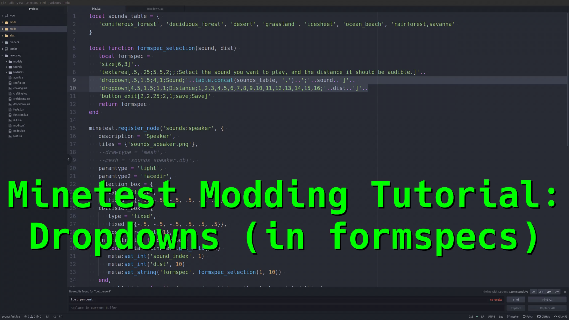 In this video I'll be covering how to create dropdowns, and read the data from them. In the second half I get a little more advanced and explain how to save the dropdown values and show them when the formspecs are opened back up. Final code is below.